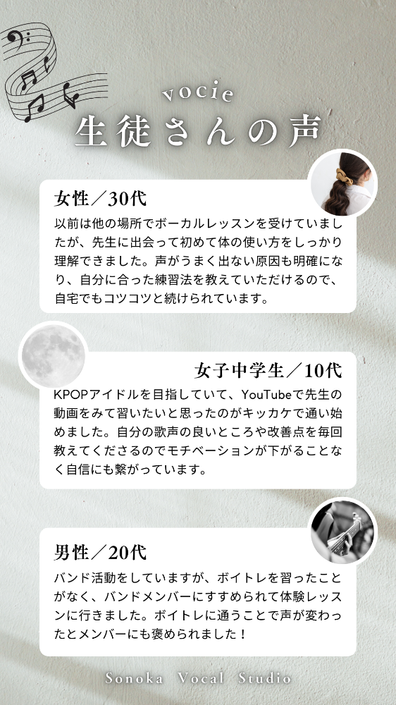 ※レッスン内容の問い合わせや教室等に関する問い合わせは、Sonoka Vocal Studioもしくは直接担当講師までご連絡ください。